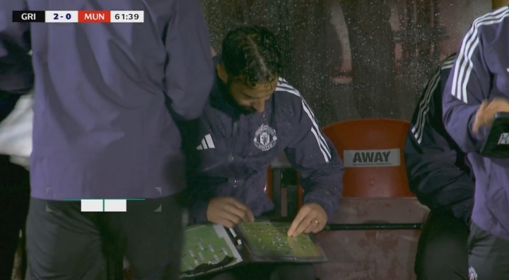 在联赛杯对阵格林斯比的点球大战中,阿莫林一直坐在教练席上,同样引起了类似的看法。守门员教练豪尔赫·维塔尔也没有露面,助理教练克雷格·莫森在指导了安德烈·奥纳纳主罚点球。这场比赛,人们记住了阿莫林的战术板,以及他赛后指责球员“说话声音太大”。